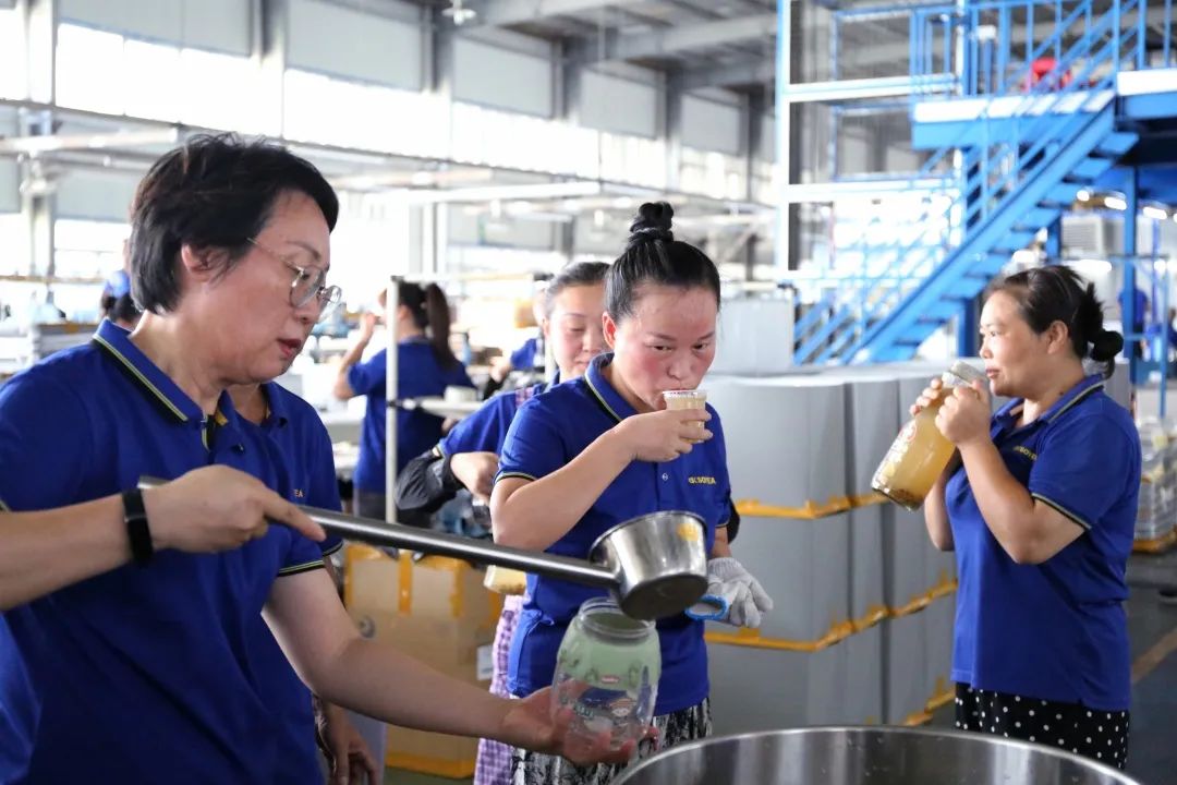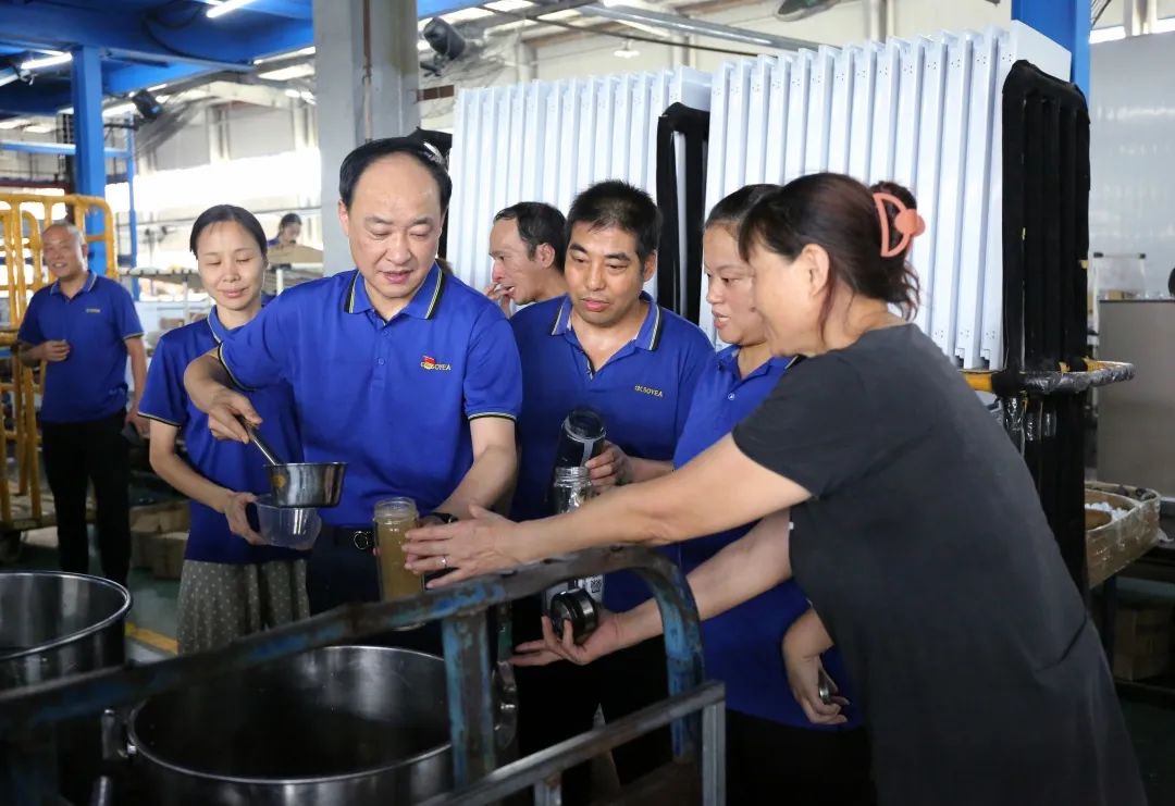 上午十點鐘,為體現(xiàn)公司領導對廣大員工的關懷,公司董事長助理倪曙東、黨委書記汪顯華來到車間,不僅是看望大家,還為大家送來了清涼可口的綠豆湯。員工們非常的開心,笑著說“真是又熱又渴,這時候給我們送綠豆湯真是及時雨”,一杯又一杯,真是清涼又可口。